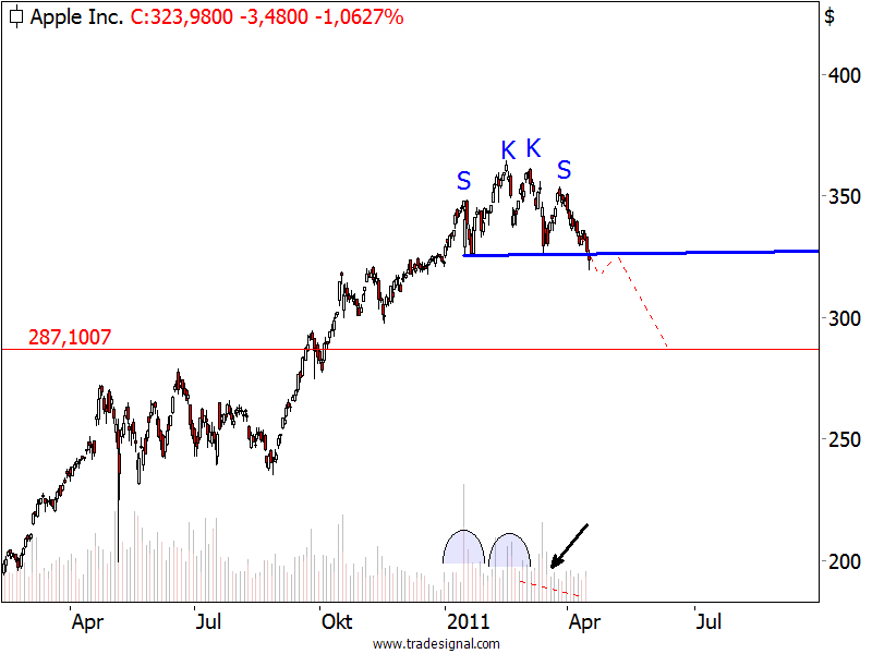 Apple hat die rechte Schulter perfekt ausgebildet (siehe Steffens Daily von 08.04.2011) und ist jetzt unter die blaue Nackenlinie gefallen. Damit wurde die Schulter-Kopf-Schulter-