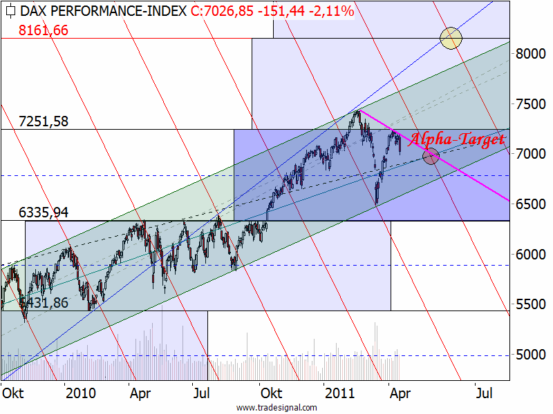 Ich habe das gelbe Rechteck (siehe Steffens Daily vom 07.04.2011) erst einmal entfernt, da die Kurse an der oberen Rechteckkante des (dunkel) blauen Rechtecks abgeprallt sind und dieses damit wieder bestätigt haben. Interessanterweise hat sich durch dieses Hoch an der Rechteckkante eine neue Linie etabliert (Pink), die auch wieder das rote Alpha-Target durchläuft und es damit verstärkt.