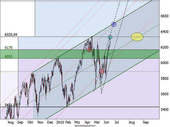 Sollte der DAX jedoch an der Rechteckkante bei 6.335 Punkten ein Top ausbilden, wäre das im Zusammenhang mit dem vorherigen Bruch der unteren Linie des grünen Aufwärtstrends am 25.05.2010 ein weiteres Schwächesignal, das damit auf eine Fortsetzung der Seitwärtsbewegung hinweisen würde. Doch nicht nur das, es wäre zudem ein deutlicher Hinweis darauf, dass die Dynamik der großen Aufwärtstrends seit den Tiefs im letzten Jahr nachlässt. (Siehe den alten und deutlich steileren Trend, der hier noch als gestrichelte rote Linien zu sehen ist).