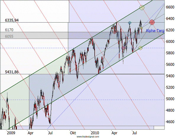 Und damit besteht die Gefahr, dass der DAX nach einem Bruch dieser roten Aufwärtstrendlinie wieder an die untere Begrenzung der Seitwärtsbewegung läuft, die nach klassischer Charttechnik bei 5.600 bis 5.700 Punkten liegen sollte - nach der Target-Trend-Methode bei 5.431.