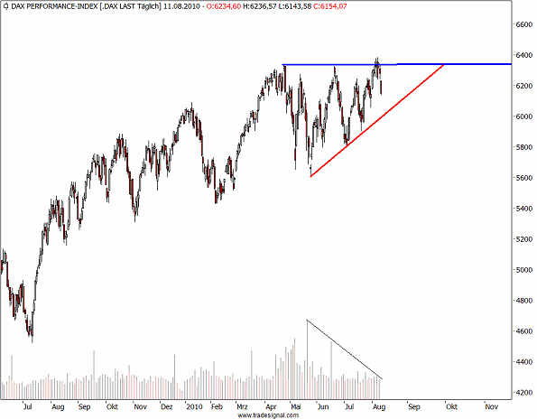 Im Prinzip entstehen solche aufsteigenden Dreiecke, wenn ein oder mehrere institutionelle Adressen ein gewisses Kursniveau als überbewertet empfinden und dort aussteigen (Bären). Hier wäre das im Bereich der 6.335 Punkte-Marke der Fall. Andere, meist ebenfalls professionelle Anleger wollen jedoch in den Markt, weil sie mit einem nachhaltigen Ausbruch rechnen (Bullen). Es kommt zum Kampf. Wenn dann die bullishen Anleger zu immer höheren Kursen einsteigen, ist dies ein Zeichen dafür, dass die Bullen stärker sind, als die Bären. Irgendwann sind die Verkaufspositionen weggefressen, so dass es meistens zu einem Ausbruch nach oben kommt. Das ist der Grund, warum diese Formation tendenziell bullish ist.