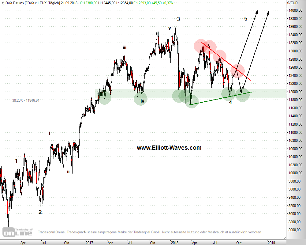 Auch wenn sich der DAX nicht an die letzte Einschätzung “DAX: 3 Kursziele” vom 28. August gehalten hat, so ist die Grundtendenz auch noch heute als bullisch bzw. positiv einzustufen. Mit dem Tagestief am 11. September mit 11.853 (FDAX) hat der DAX erneut das 38,2 % Korrektur-Retracement sowie die grüne Unterstützungszone erreicht, die bereits im Februar und März und in der Analyse “DAX und Dow: Jetzt kommt der ganz große Crash! Ganz sicher!” vom 11. Februar eine wichtige Rolle gespielt hat. Und nun der erneute Pullback! Zufall?