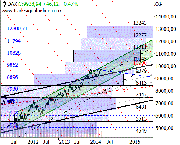 Und für die Target-Trend-Methode ist die 10.000er Marke lediglich auch nur als psychologischer Widerstand interessant. Wichtiger sind andere Marken: Wie schon geschrieben, musste die Mittellinie bei 9.862 Punkten überwunden werden. Das ist nun geschehen. Als nächster Widerstand wartet die 10.345er Marke. Das ist nach der Target-Trend-Methode jetzt das Kursziel oberhalb der 10.000er Marke. Und es ist damit unser erstes Kursziel im luftleeren Raum der klassischen Charttechnik.