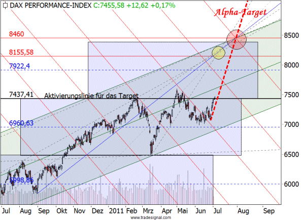 Aus Sicht der Target-Trend-Methode ist der DAX damit an die wichtige Rechteckoberkante bei 7.437 Punkten gestiegen. Hier tut er sich seit drei Handelstagen erwartungsgemäß etwas schwer: