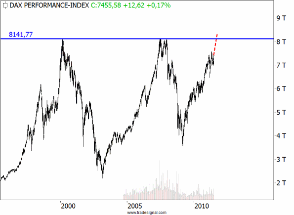 Auf der anderen Seite treten sie in Übertreibungsphasen vor entscheidenden Hochs auf. So hat es vor dem DAX-Hoch im Jahr 2007 einen derartigen Anstieg gegeben und auch vor dem 2000er Hoch. Beim letzteren war der Anstieg zeitlich sogar noch ausgeprägter.