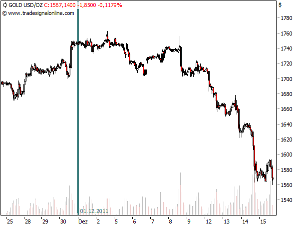 Bei der Überlegung für die Kursrückgänge in allen Assetklassen kam kurz die jüngste Entscheidung der US-Notenbank Fed in Betracht. Diese hatte am Dienstag aufgrund der positiveren Aussichten für die US-Konjunktur auf weitere geldpolitische Maßnahmen, z. B. in Gestalt eines QE3 (quantitative easing), zunächst verzichtet. Und eigentlich fallen die meisten Werte erst seit dem 8. oder 9. Dezember mit zunehmender Dynamik. Trocknen die Märkte nun aufgrund mangelnder Liquidität aus? Werden daher auch Goldpositionen aufgelöst, um flüssige Mittel locker zu machen?