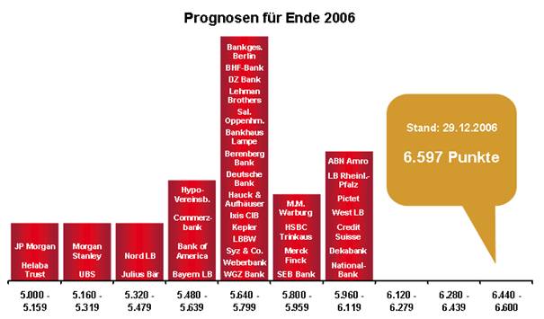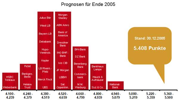 Entsprechend weit lagen auch die Experten daneben. Nehmen wir die jährliche Umfrage des Handelsblatts als Grundlage, so ergibt sich folgendes Bild: Im Jahr 2005 lag die Durchschnittsschätzung rund 1000 Punkte vom tatsächlichen DAX-Stand weg, die beste Bank immerhin rund 400 Punkte entfernt.