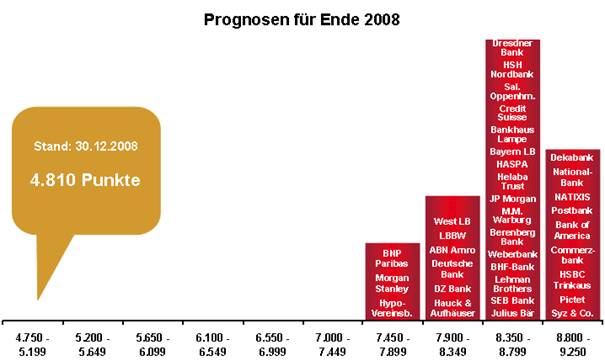 Das zugegebenermaßen äußerst schwierige Börsenjahr 2008 brach alle Rekorde: Während die meisten Analysten einen Anstieg des DAX auf Rekordstände jenseits von 8300 Punkten erwarteten, schmierte der Index tatsächlich auf 4810 Zähler ab. Ergebnis: Der Konsens lag etwa 3500 Punkte schief, der „beste“ Tipper immer noch fast 3000 Punkte.