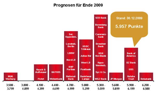 Als ein Resultat des Ausnahmejahrs 2008 war die Bandbreite der Schätzungen für das Jahr 2009 so weit wie vermutlich nie zuvor: Sie reichte von 3500 bis 6500 Punkten. Erstmals wurden also auch von einigen Analysten weitere deutliche Kursverluste vorhergesagt. Und siehe da: Angesichts dieser Spanne tippten einige Analysten tatsächlich richtig und näherten sich dem tatsächlichen DAX-Stand bis auf wenige Punkte. Das Gros lag allerdings erneut zwischen 500 und 1000 Punkten daneben.