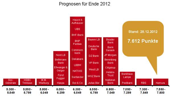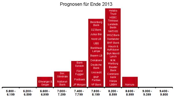 Wo steht der DAX Ende 2013? Das ist wohl die meistgestellte Frage an der Börse. Es gibt viele Prognosen - aber die meisten erweisen sich als falsch. Am Ende ist es reine Glückssache, ob ein Experte die richtige Zahl trifft. - Die meisten liegen in schöner Regelmäßigkeit völlig daneben.