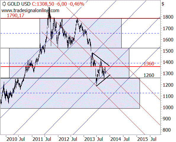 Bei Gold hat sich nichts wirklich Positives getan. Gerade ist der Goldpreis an der 1.360er-Marke nach unten abgeprallt – ein weiteres eher bearishes Zeichen. Zudem bildet sich eine Dreiecksformation (schwarze Linien) und diese ist in den meisten Fällen eine Trendfortsetzungsformation. Auch das deutet auf weiter fallende Kurse hin. Als wichtige Signallinie gilt nach der Target-Trend-Methode die 1.260er Linie. Wird diese nun erneut nachhaltig unterschritten, ist mit weiter fallenden Kursen bis 1.130 Dollar zu rechnen.