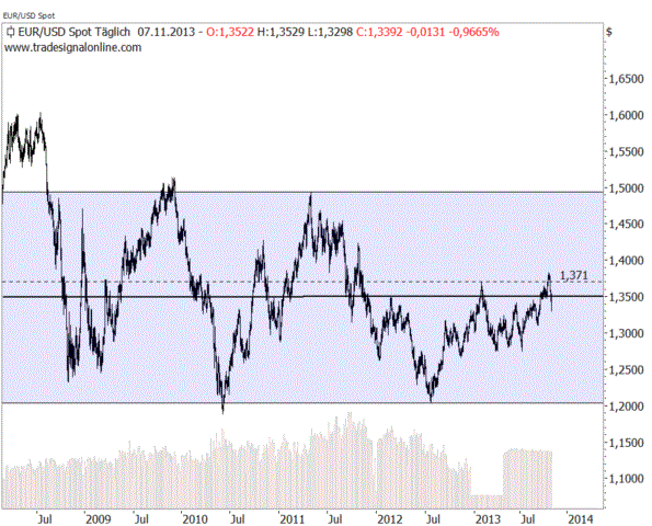 Der Euro hat vor Kurzem nicht nur die Mittellinie des aktuellen Rechtecks bei 1,35 Euro überwunden, sondern sogar ein neues Hoch ausgebildet, indem er über die 1,371-Dollar-Marke gestiegen ist. Aus charttechnischer Sicht war dies ein klares Kaufsignal. Der anschließende Test der 1,35er Marke wäre noch vollkommen in Ordnung und ebenfalls bullish zu werten gewesen.