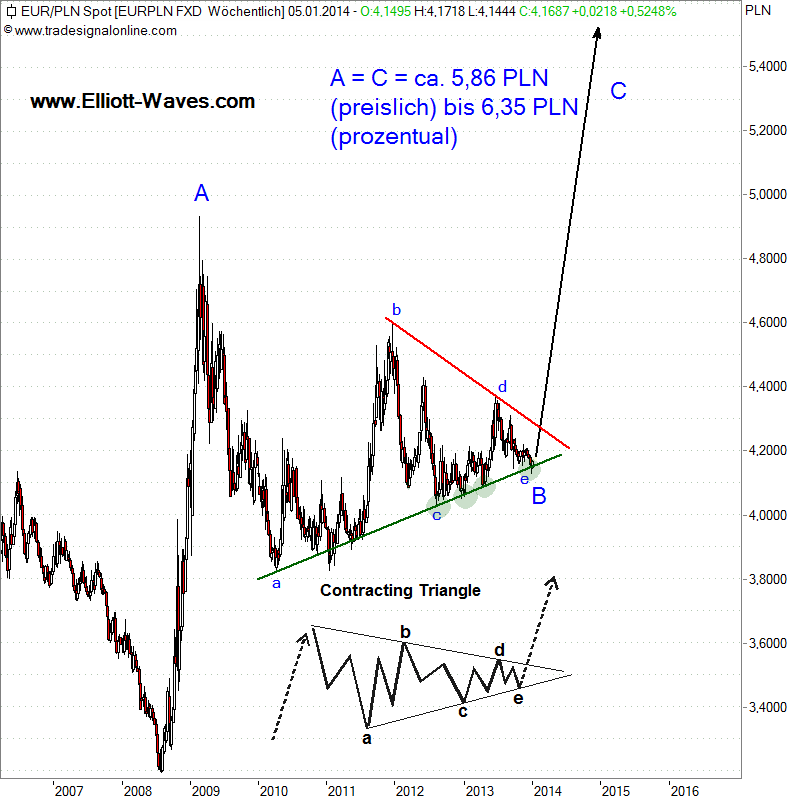 Auffällig ist nun, dass das Gezappel der letzten Jahre ein zusammenlaufendes Dreieck geformt hat. Nach dem senkrechten Anstieg in 2008/09 kann das nach Elliott Wave meiner Meinung nach nur eine Konsolidierungsformation im Rahmen einer großangelegten Korrekturwelle B sein. Das Dreieck deutet des Weiteren an, dass wir beim Złoty in diesem Jahr eine ähnlich starke und dynamische Abwertungswelle wie damals sehen könnten. Im Rahmen der Ausbruchswelle C traue ich dem Euro gegenüber dem Złoty einen Höhenflug auf 5,86 bis 6,35 PLN (A = C preislich bzw. prozentuell) zu. Und das noch in diesem Jahr. Die Kursziele sind so extrem, dass sie gar nicht mehr auf der Preisskala zu sehen sind.