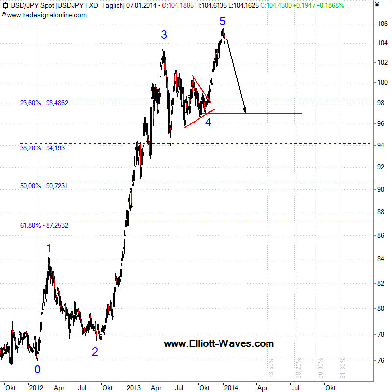 Zum Anderen kommt die Trendbewegung seit Anfang 2012 so langsam in die Jahre. Nach Elliott Wave sehen wir im Tages-Chart einen klassischen 5-teiligen Aufwärtsimpuls, der am 2. Januar mit 105,45 JPY beendet wurde. Damit kündigt sich jetzt eine entsprechende Gegenbewegung an, die – solange das genannte Hoch nicht mehr überschritten wird – mind. das Niveau der Welle 4 bei ca. 97 JPY erreichen wird. Andere (tiefere) Korrekturziele sind natürlich möglich, aber zum jetzigen Zeitpunkt noch nicht konkret absehbar.