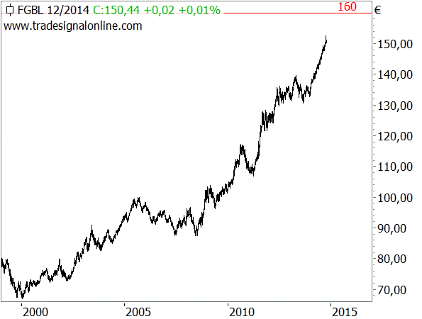 Der Euro-Bund-Future ist eine fiktive Bundesanleihe mit einem Kupon von 6 Prozent und einer Laufzeit von 10 Jahren. Bei 160 hätte diese Bundesanleihe eine Rendite von 0 Prozent. Seit vielen Jahren sind ökonomisch versierte und durchaus vernünftige Anleger bereits davon überzeugt, dass der Bund-Future nicht mehr weiter steigen kann – weil er bereits ein solches Extrem erreicht hätte. Und doch strafte die Realität bisher all diejenigen Lügen, die aufgrund der Bewertung auf fallende Kurse gesetzt haben.