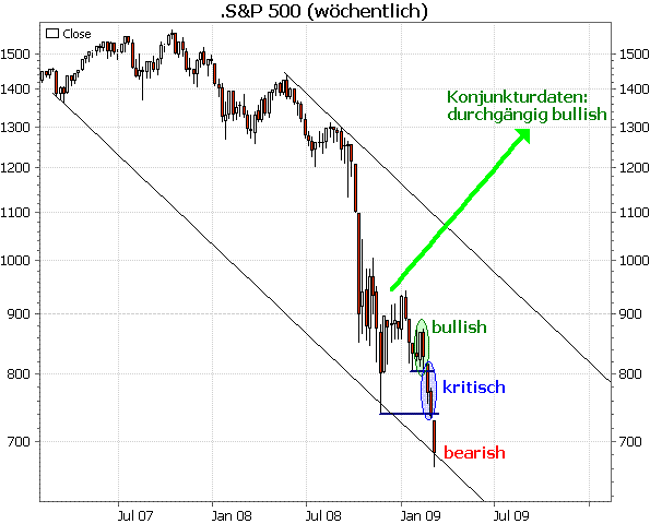 Bis MitteFebruar war eine optimistische Haltung noch angebracht (siehe Chart).Damals hatten wir noch die Chance auf ein höheres Tief im S&P500 und weiter steigende Kurse (grüne Ellipse). Auch ich hattedamals diese Parallele gezogen. Inzwischen hat sich jedoch dieSituation geändert (nach einer kritischen Phase – blau– ist der Bruch des letzten Tiefs eindeutig bearish). In derbereits erwähnten neuesten Ausgabe unserer Stockstreet InvestmentStrategie haben wir daraus sofort die Konsequenzen gezogen und unsereTaktik angepasst.