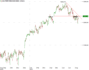 Heute haben wir weiter Risiko aus dem Depot genommen und unsere DAX-ETF-Position gedrittelt. Warum gerade heute? Der Dax ist an einem Kreuzwiderstand angekommen, der sich aus der oberen Begrenzung der so genannten Macron-Eröffnungslücke und der laufenden Abwärtstrendlinie herleitet (siehe Grafik). Das könnte für Spekulanten der Anlass sein, entweder kurzfristige Gewinne mitzunehmen oder auch wieder à la Baisse zu spekulieren.
