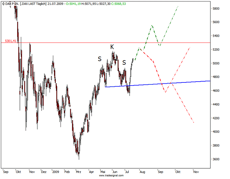 In Steffens-Daily vom 03.07.2009hatte ich Ihnen zwei Vergleichscharts vorgestellt: Den DAX nach dem 11.September 2001 und den DAX im Jahr 2005. In beiden Fällen bildetesich eine SKS, deren Nackenlinie gebrochen wurde. In beiden Fällenstellte sich dieser Bruch als Fehlsignal heraus, und es folgte einmassiver Anstieg: