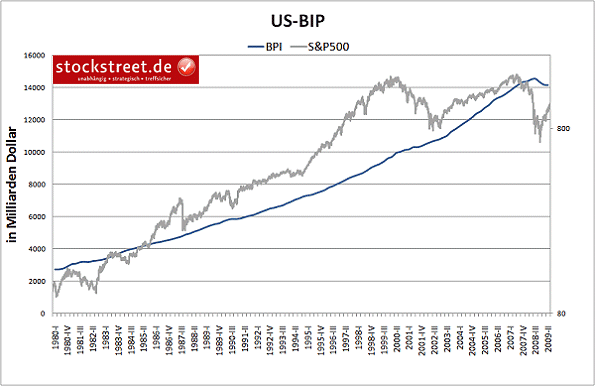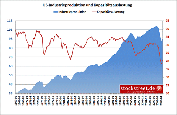 Zunächst muss man allerdings davonausgehen, dass sich das Wirtschaftswachstum in den nächsten Quartalenerholt und recht bald auch wieder die alten Hochs aus dem drittenQuartal 2008 erreicht. Doch wenn die stimulierende Wirkung der enormenUS-Konjunkturmaßnahmen und der Niedrigzinspolitik auf die US-Wirtschaftzu Ende gehen, dürfte es für die US-Wirtschaft schwer werden, einselbstragendes Wachstum zu generieren. Wir haben es zurzeit mit einerextrem niedrigen Kapazitätsauslastung zu tun, und auch dieIndustrieproduktion ist deutlich zurückgekommen.