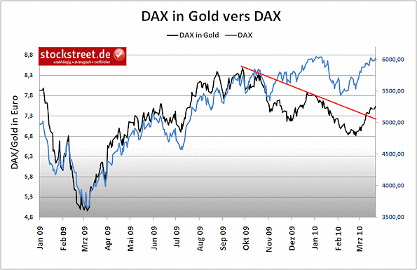 Hier sehen wir den Aufwärtstrend desDAX seit dem Finanzmarkt-Crash in Gold (schwarz) und in Euro (blau).Natürlich war zu erwarten, dass mit der Abwertung des Euros Endevergangenen Jahres die beiden Charts deutlich auseinanderlaufen.Während der reguläre DAX scheinbar immer neue Hochs ausbildet, kam esim Gold-DAX zu einem klar erkennbaren Abwärtstrend. Auch hier haben wirkeine neuen Hochs gesehen – bisher. Und auch hier scheint mir derKursverlauf angesichts der Probleme vieler Mitgliedsstaaten in der EUwesentlich realistischer.