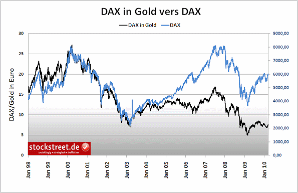 Ich hatte im vergangenen Oktoberbereits den Dow Jones statt in Dollar in Gold dargestellt. Einfach umaufzuzeigen, wie sich der Dow Jones ohne den Dollarverfall entwickelthaben könnte. Damals hätte ich nicht gedacht, dass ich bereits nach sokurzer Zeit das Gleiche für den DAX tun würde. Doch aufgrund desEuro-Verfalls in den letzten Monaten liegt es nahe, einen mehr oderweniger objektiven Vergleichswert zu finden, und hier bietet sich Goldeinfach an.