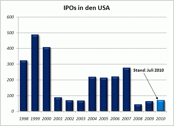 Genauso folgerichtig fielen die Zahlen für 2008 / 2009 wieder auf neue Tiefs. In diesem Jahr ist nun ein erneuter deutlicher Anstieg zu erkennen. Auffallend dabei: die Zahl der Börsengänge, die per Juli dieses Jahres bereits abgeschlossen wurden, übersteigt bereits die gesamte Vorjahreszahl!