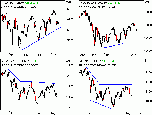 Während der DAX nach beinahe jedem Einbruch sein im April markiertes Jahreshoch wieder erreichen konnte, gelang dies keinem der anderen Indizes. Beim Euro STOXX 50 ist dies aufgrund der Eskalation der Euro-Schuldenkrise verständlich.