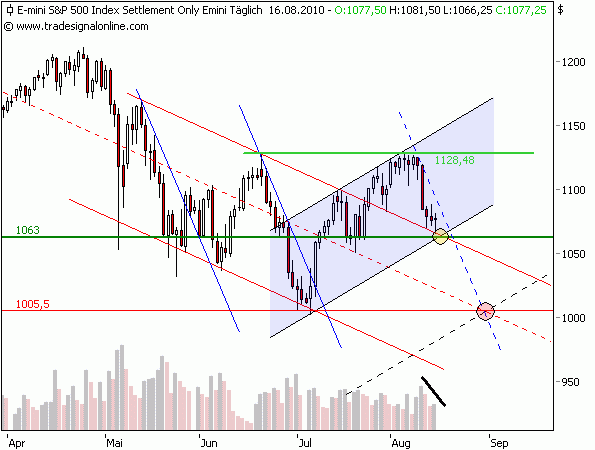 Sie sehen aber auch, was uns erwartet, wenn die Schlüsselstelle bei 1.063 Punkten nicht hält: Dann rückt sofort das rote Target ins Visier und damit das Tief vom Juli! Hier besteht dann erneut die Chance auf eine Bodenbildung, aber die charttechnische Lage trübt sich damit natürlich erheblich ein.