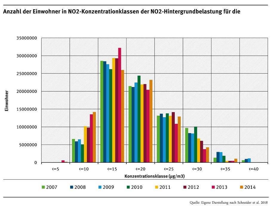 Diese vom UBA selbst in Auftrag gegebene Untersuchung dokumentiert, dass nur ein verschwindend kleiner Teil der deutschen Bevölkerung überhaupt an Orten wohnt, wo die Immissionsmesswerte den Jahresgrenzwert von 40 µg/m3 überschreiten. Schon seit 2010 gibt es selbst in der Kategorie zwischen 35 und 40 µg/m3 gar keinen Farbbalken mehr, und die Kategorie über 40 µg/m3 wird gar nicht mehr aufgeführt.