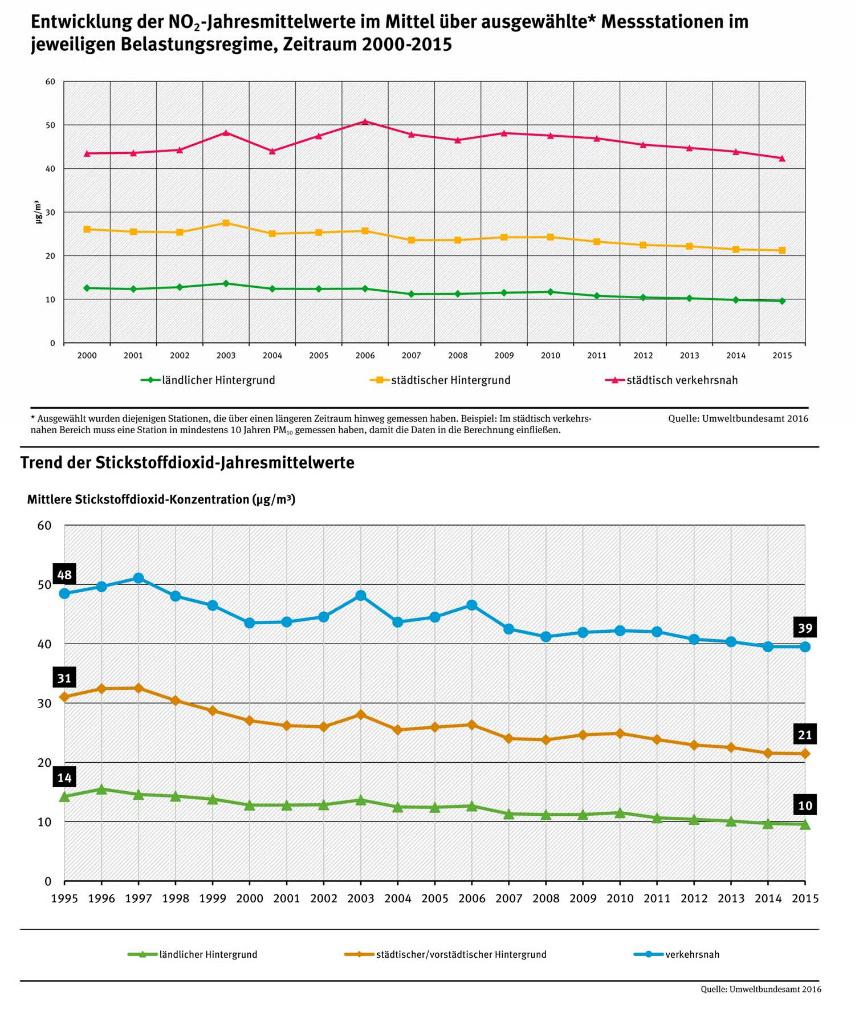 Vorab sei noch kurz angemerkt, dass das Umweltbundesamt (UBA) im Rahmen seiner neuesten Veröffentlichung über angeblich 6.000 NO2-Tote und über 400.000 angebliche Diabetesfälle durch NO2 im Jahre 2014 so freundlich war, eine Grafik zu veröffentlichen, die seine eigene ständige Panikmache als Fake-News entlarvt, Bild 2.