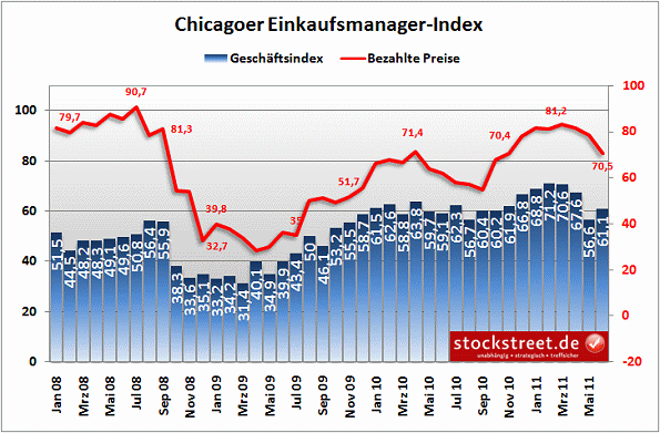Nachdem es gestern eine positive Nachricht vom US-Immobilienmarkt gegeben hat, die auf eine mögliche Trendwende hinweist (siehe Steffens Daily von gestern), ist auch das eine beachtliche Entwicklung. Ist die rezessive Entwicklung der US-Wirtschaft der vergangenen Monate vorbei? Der Chicagoer Einkaufsmanagerindex ist deswegen so wichtig, weil in dieser Region die Automobilindustrie ansässig ist. Und diese Branche gilt als einer der großen Motoren des US-Wirtschaftswachstums.