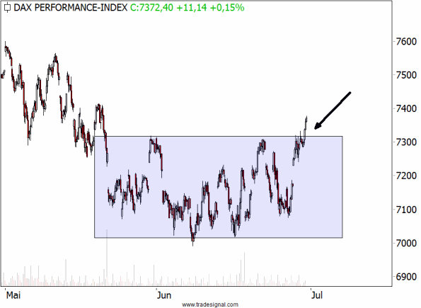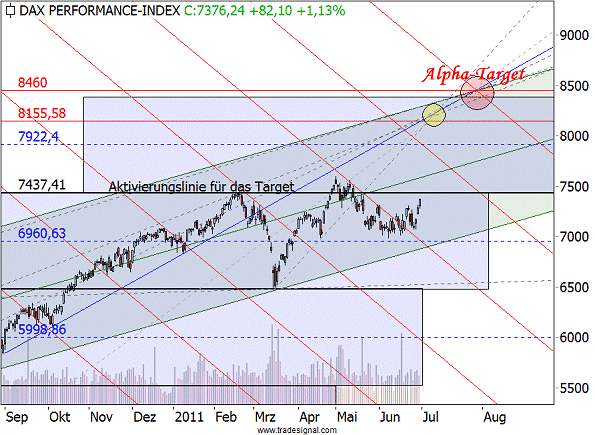 Trotz des Ausbruchs heute bleibt dies eine sicherlich ambitionierte Prognose, wenn sie auch nicht gänzlich unmöglich ist. Sie haben es schon mehrmals miterlebt: Diese Targets verblüffen immer wieder. Aber trotzdem noch einmal der Hinweis: Eigentlich wird das Target erst dann aktiviert, wenn der DAX die 7.437er Marke überwindet. Wir werden also sehen, was bis dahin passiert.