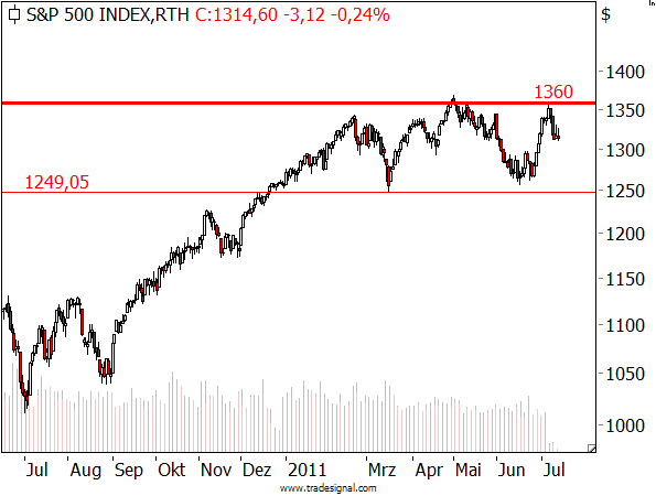 Wir befinden uns immer noch in der Nähe der Jahreshoch. Der S&P500 ist erneut an der hier seit Monaten als höchst relevant vorgestellten 1.360er Widerstandsmarke abgeprallt. Mehr ist aus charttechnischer Sicht noch nicht passiert. Wir sehen hier, wie auch im DAX, eine große Seitwärtsbewegung, aber noch keine Anhaltspunkte für eine nachhaltige Schwäche.